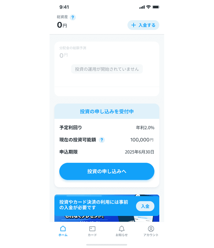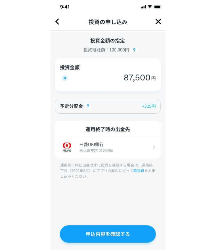 1,000円以上を入金したら、先程の画面の「投資の申し込みへ」ボタンから投資の申し込みができます。1,000円から最大5,000万円まで投資可能です。