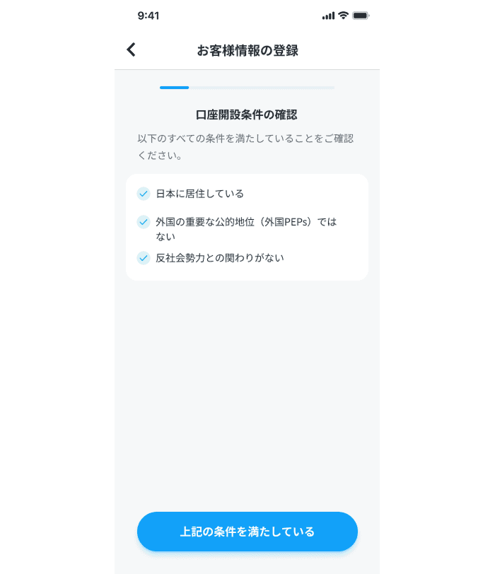 口座開設の条件と同意書の確認を行い、個人情報の入力に進みます。