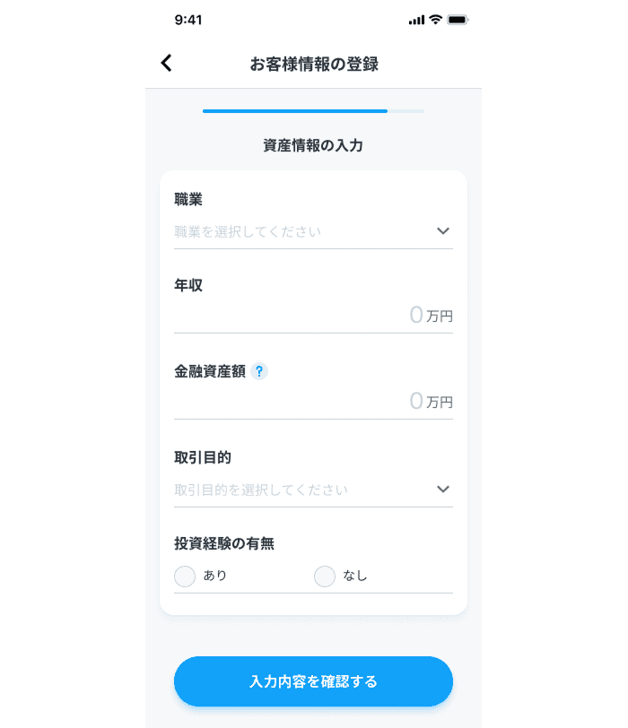 次に、職業や年収、金融資産額を入力し、最終確認をしたら登録完了です。