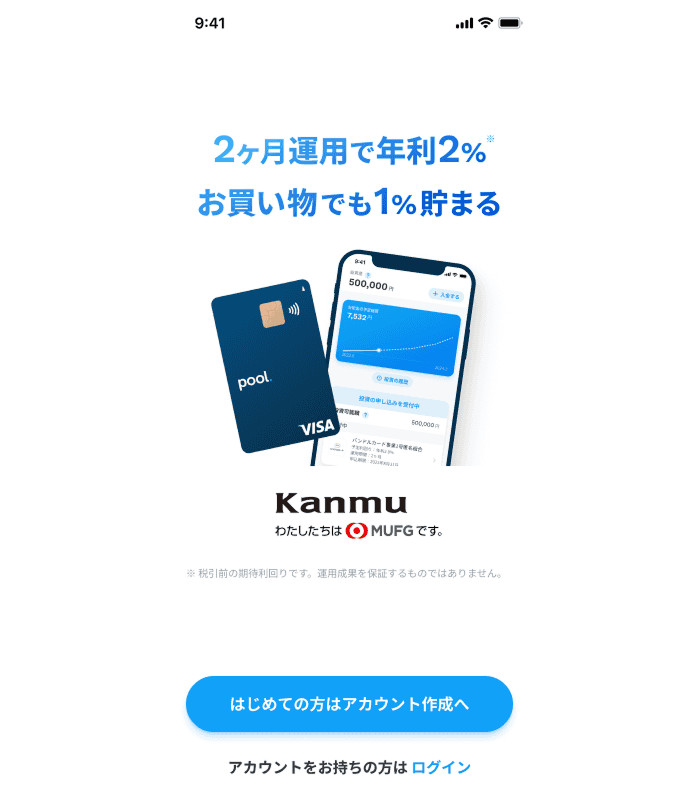 Poolは予定利回りの資産運用とクレジットカードが一体になったサービスです。 主な特徴は以下のとおりです。