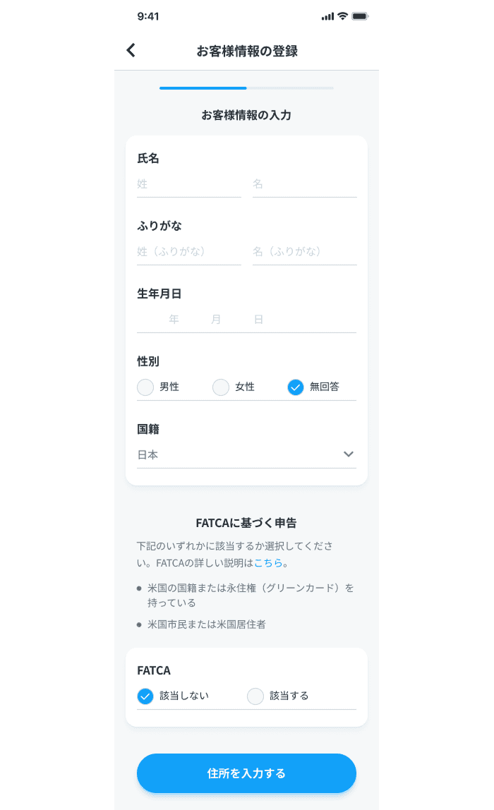 氏名、生年月日、性別、国籍などを入力します。